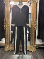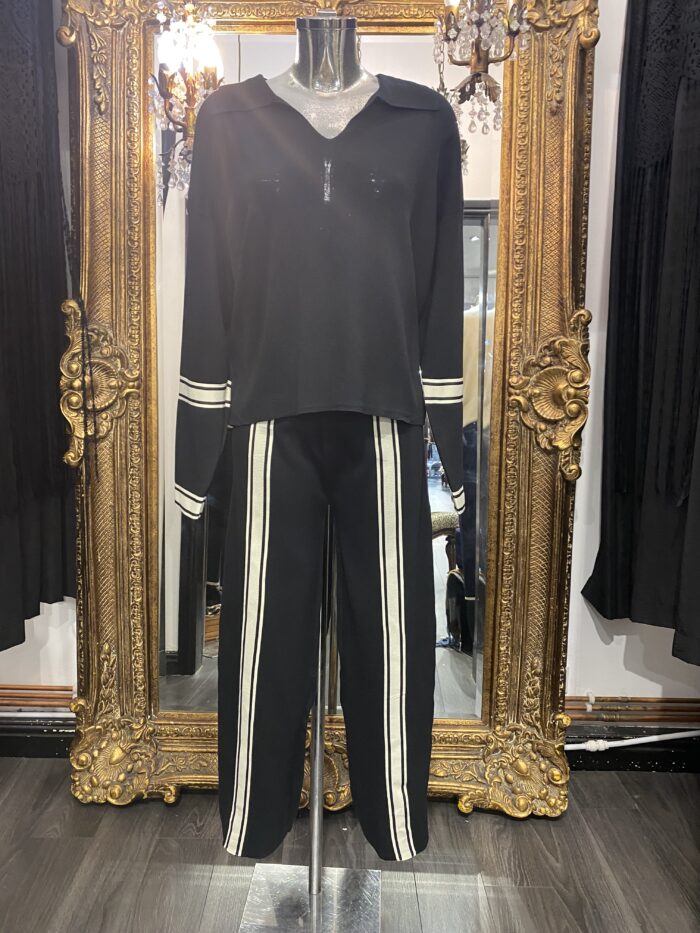 Black Knitted Lounge Suit With Cream Trim & Button Shoulder Detail