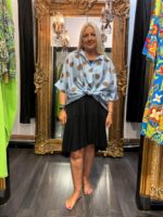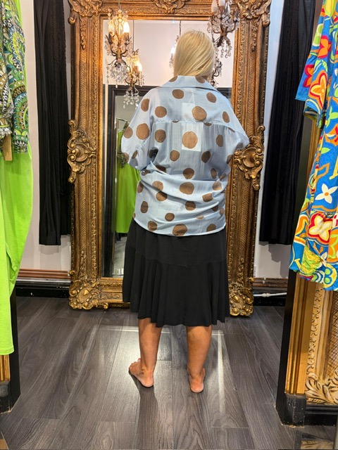 Ladies Blue & Brown Spot Shirt. Lovely tied and worn over a dress. Can be worn open over a vest or buttoned up.