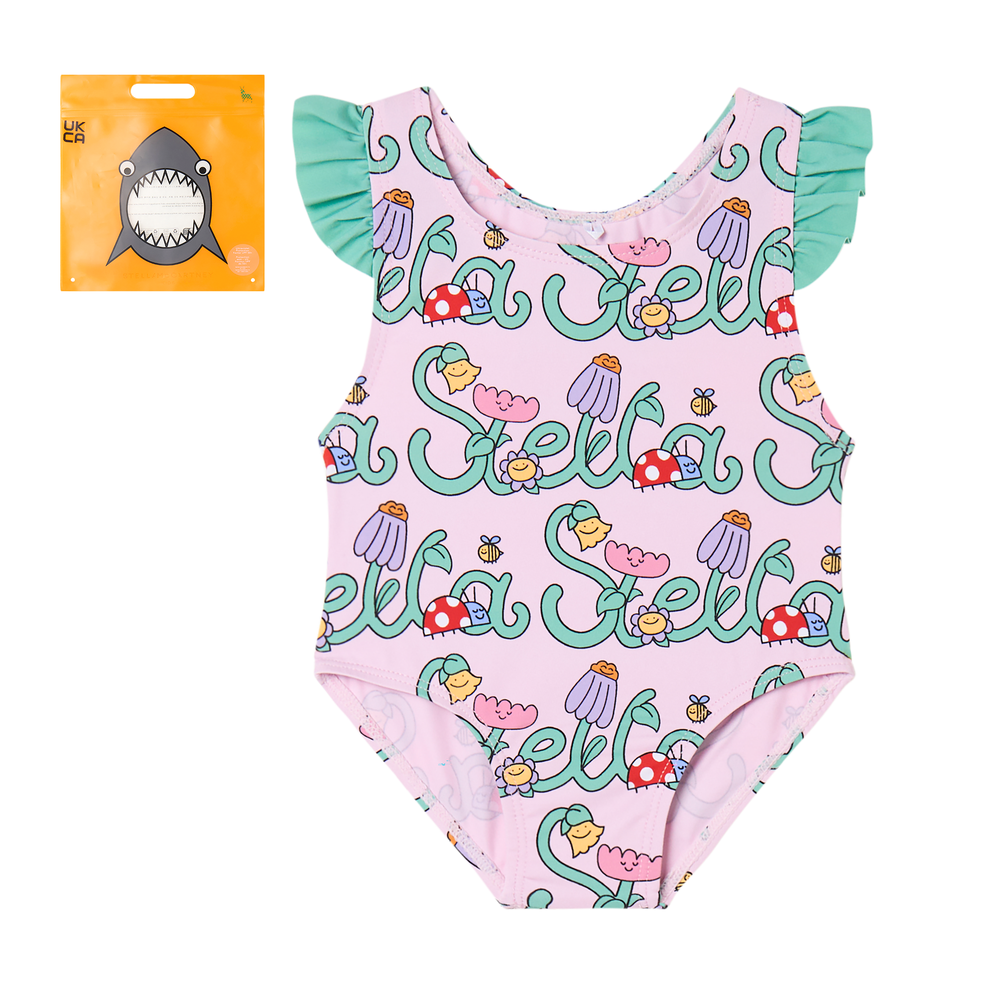 Stella McCartney Pink Patterned Swimsuit With Green Frill Shoulder Detail