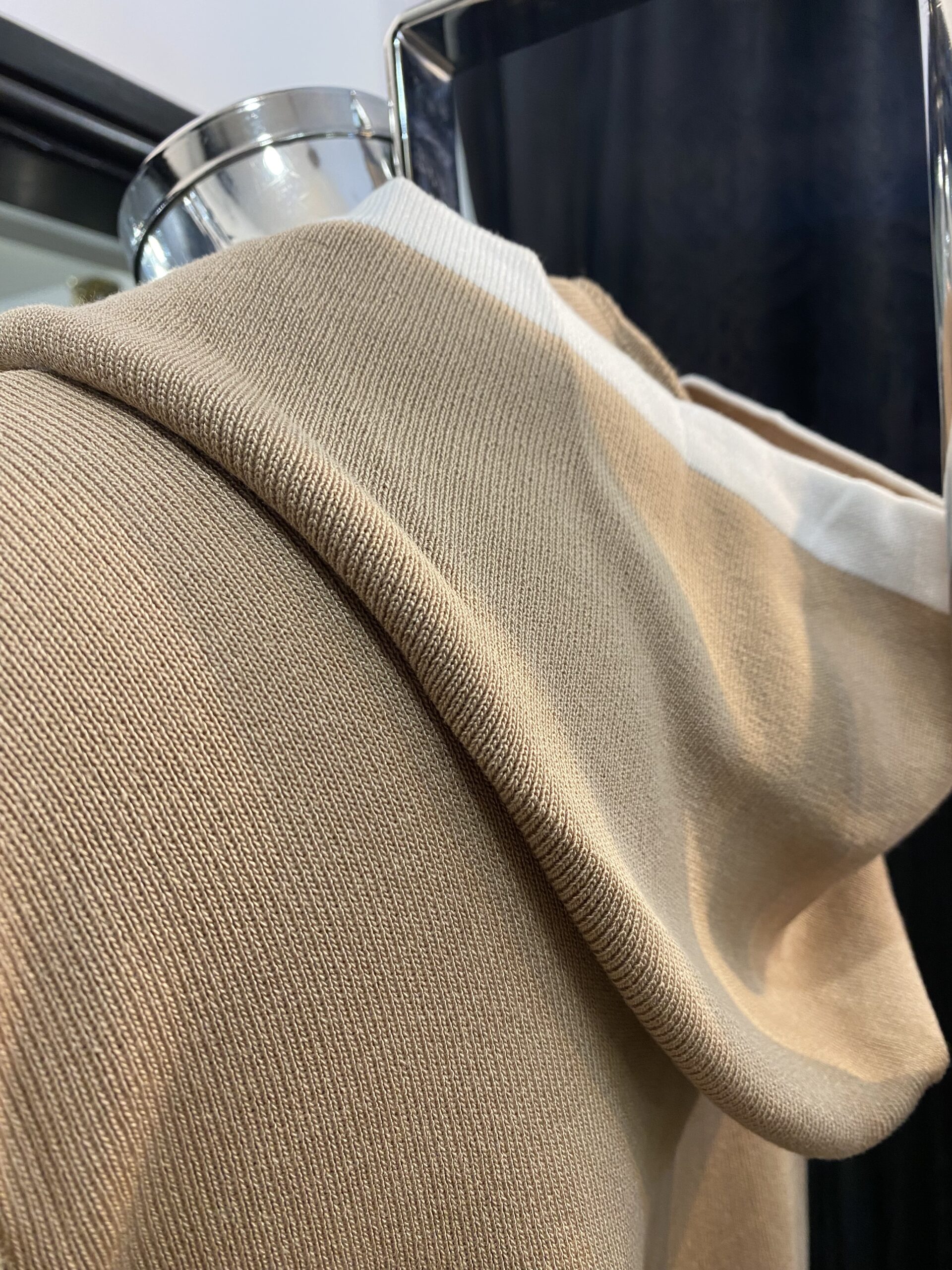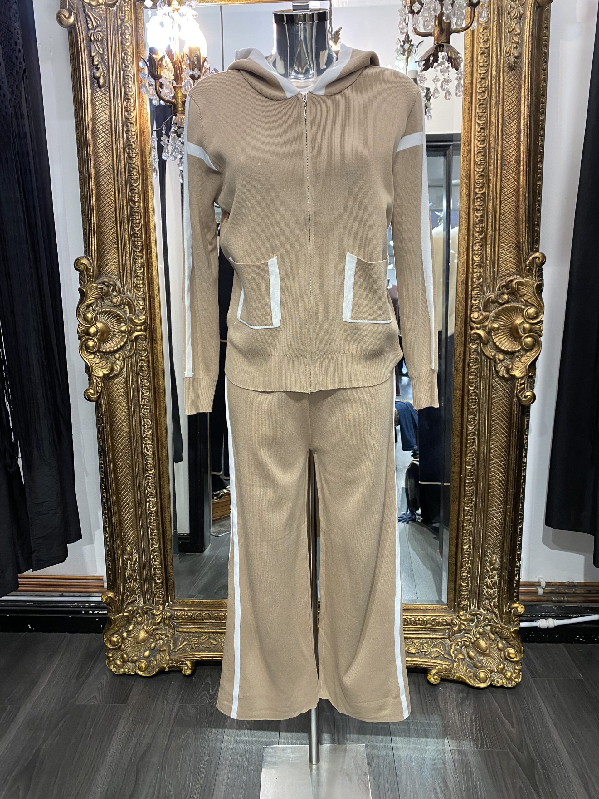 Stone Knitted Lounge Suit With Hood, Pockets & Cream Trim